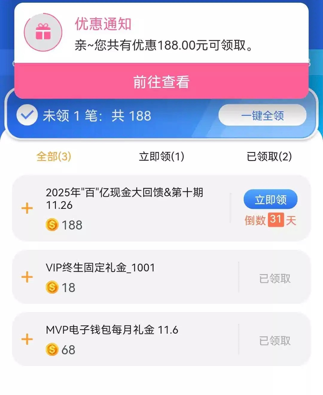 有历史充值过的兄弟可以登入上看一下自己有没有得领